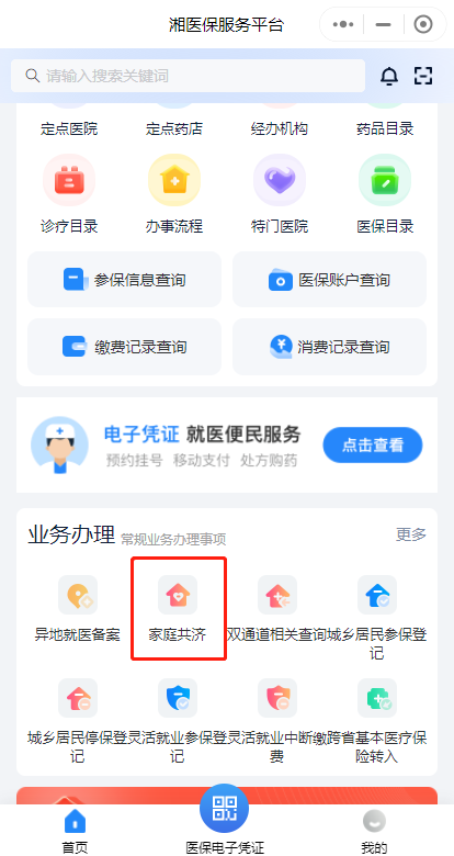 第一步:下載“湘醫(yī)保”App,或進(jìn)入“湘醫(yī)?!盇pp小程序,登錄后在首頁(yè)“業(yè)務(wù)辦理”中找到“家庭共濟(jì)”,點(diǎn)擊“共濟(jì)申請(qǐng)”。